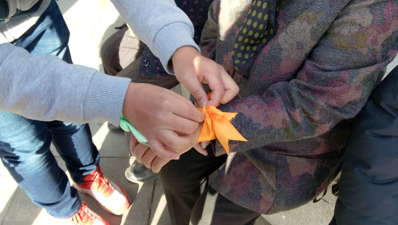 周日早上7:00,16030542班的全体同学在文韬2号公寓楼下集合完毕,一同前往市里的万达广场附近进行采访活动。每名队员都积极地表达了自己的想法,为采访活动的顺利进行添砖加瓦。到达采访地点,同学们按照之前确定的小组分散进行采访,每个组分工明确,有的采访、有的拍照、有的记录,还有同学为被采访的人系上丝带,一切进行得有条不紊。