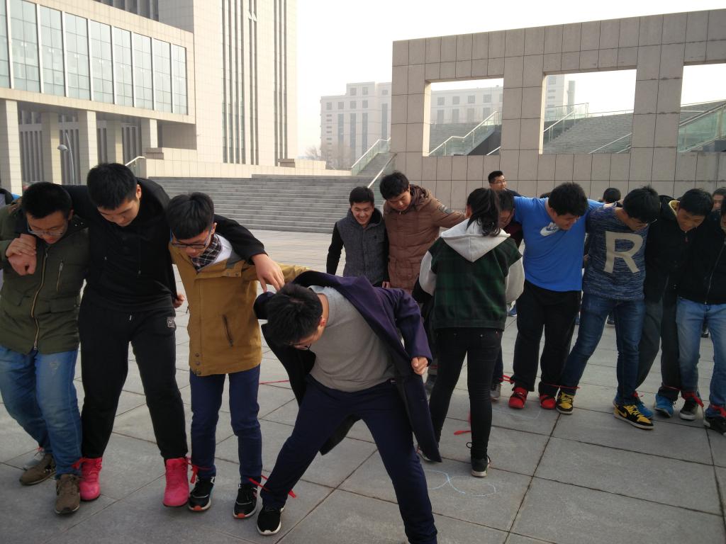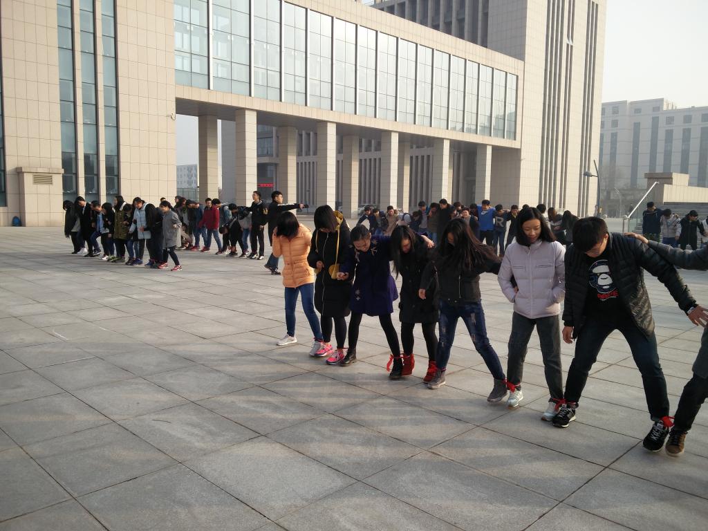 多人版“两人三足”中,每十名同学的腿两两相绑。游戏前,同学们纷纷提出自己的想法来让自己队伍的行进速度更快,各小组汇集每位队员的想法,从而提炼出一套最可行的办法。在游戏中,每组小队心往一处想,劲往一处使,真真正正的体会到团结的重要性。随后进行的“过河拆桥”游戏中,每个小组的队员通过在上个游戏中对队友的了解,配合的更有默契。每一个小组都很快进入状态,每一位队员也更加深刻的体会到团结对于一个团队的重要性。