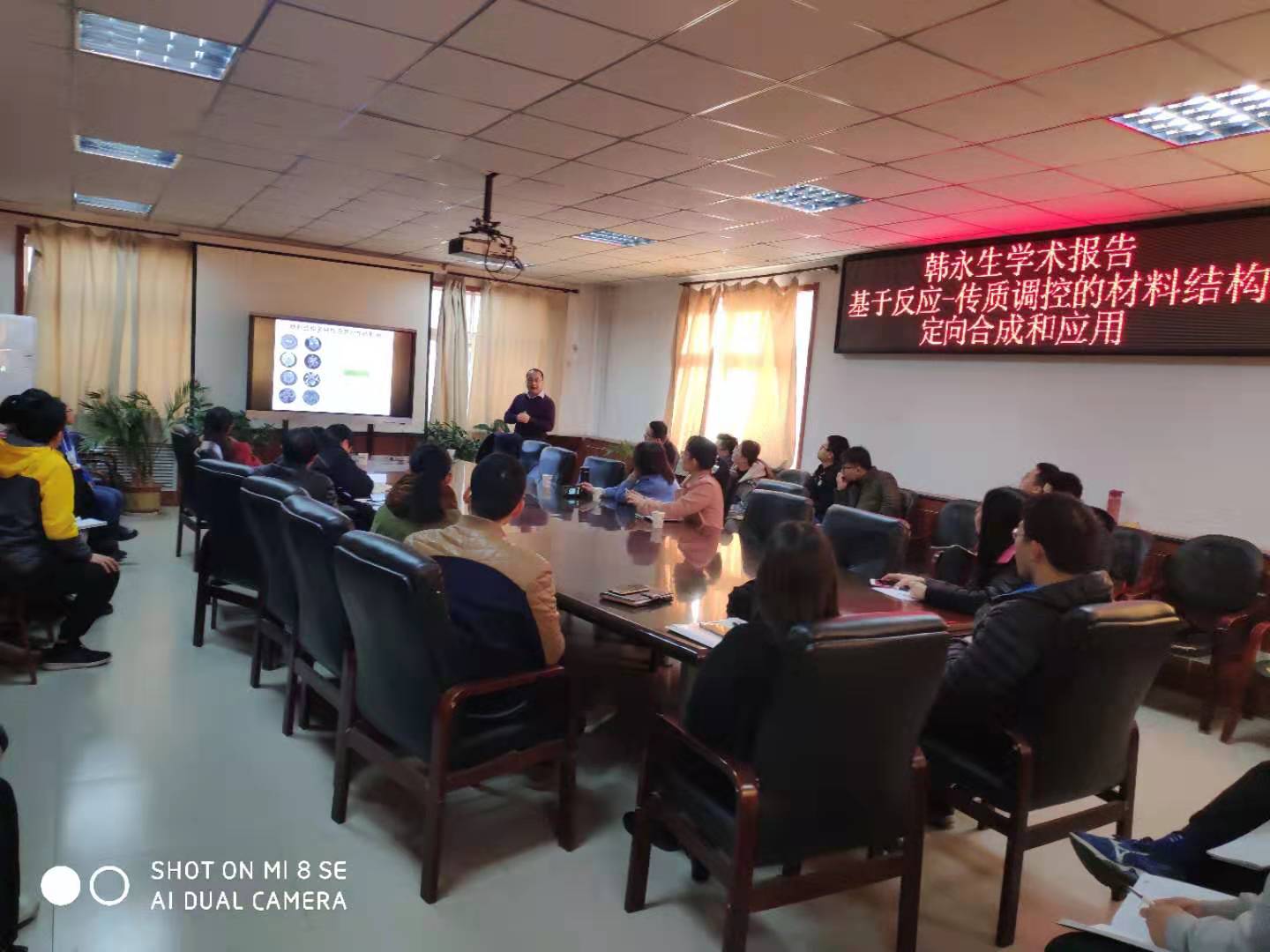 邀请,中国科学院过程工程研究所韩永生研究员来我校进行学术研讨和交流,并作了题为 “基于反应-传质调控的材料结构定向合成和应用” 的学术报告。